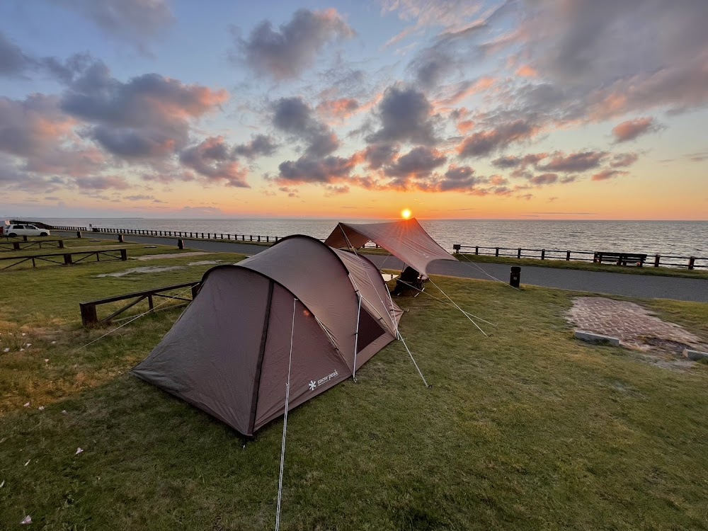 ここはいつ来ても最高です。 晴れた日の海&夕日のロケーションが素晴らしいです。 全サイトが横1列で並んでいるキャンプ場なので、他のキャンパーさんと向かい合わせのシチュエーションが無い点も○。 各サイト10m✕10mなので、一般的なスタイルなら十分な広さがあります。 HPでは芝と言いつつ雑草を刈っただけのキャンプ場もありますが、こちらは綺麗な芝です。時期やサイトにより多少砂地が出ていますが、概ね全面芝です。 又、各サイトに焚き火台用でコンクリートブロックが4つ置いてあるのも有難いです。 海沿いなのでいつ来ても虫達が殆ど居ませんが、風が強く吹く日がありますのでガイロープは強めに張って下さい。 予約が取りにくいキャンプ場で有名ですが前日までなら「キャンセル料不要」と言う理由もあると思います。ですので小まめなチェックをしていると直前に空きが出る事が多々あります。 Aサイト〜Dサイト、バイクサイト、フリーサイト(フリーサイトは最近再開)があります。 Aサイト…管理棟や温泉が近く便利ですが、テトラポットがあり多少景観を損ないます。 Bサイト…同じく目の前にテトラポットがあり多少景観が劣ります。海水浴には多少近くなります。 Cサイト…テトラポットは無くなりロケーションは最高です。管理棟より少し離れますが海水浴場にも割と近いです。 Dサイト…同じくテトラポットは無く、海水浴場が間近。管理棟からはかなり遠くなります。 フリーサイト…一番奥がフリーサイトです。車の乗り入れ出来ませんが海水浴場が目の前です。 2025.8月時点 大体こんな感じです。