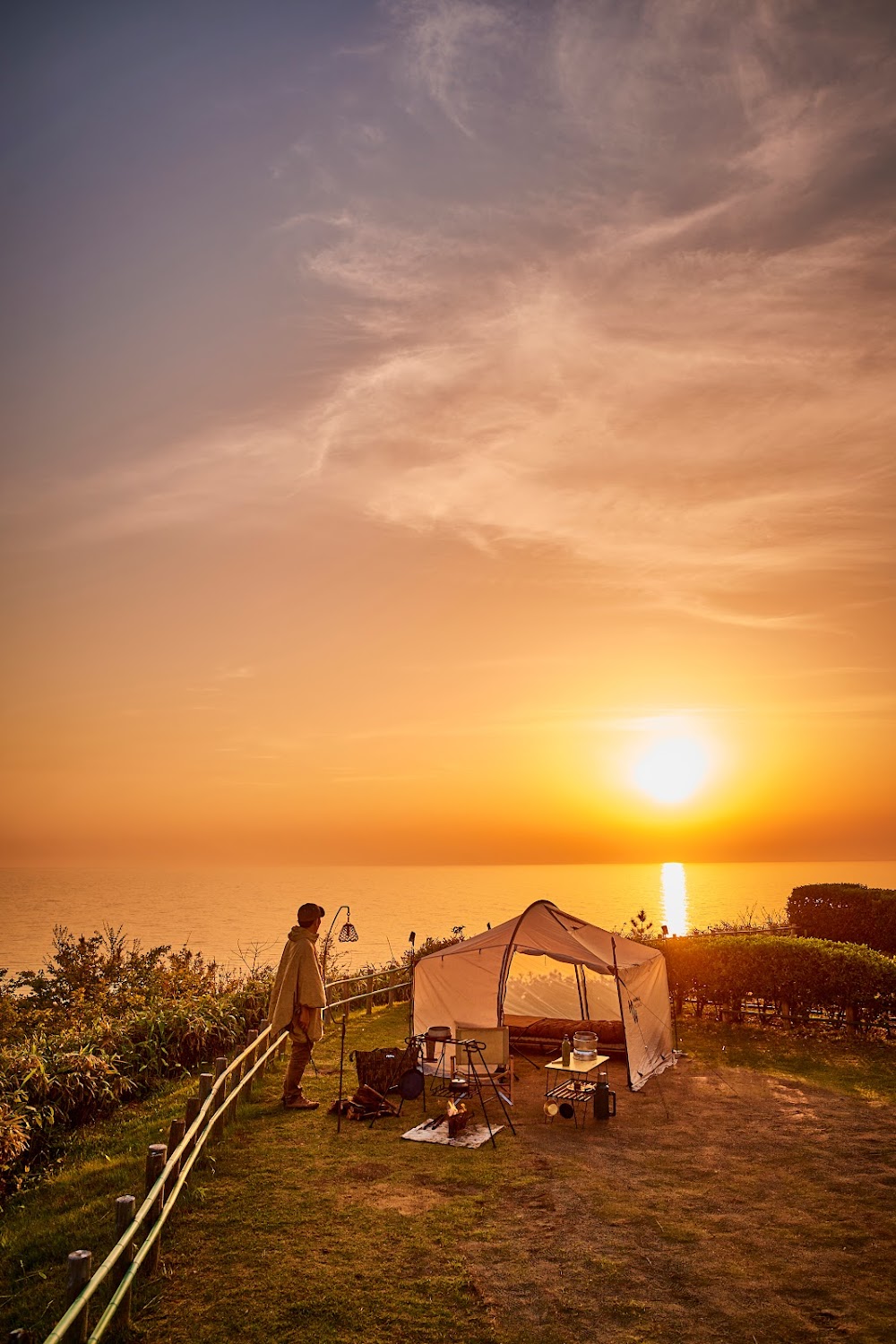 新潟県の海岸線中央に位置し、日本海を見晴らす丘に整備されたキャンプ場です。遊歩道を降りたらすぐに市営の落水海水浴場があります。
