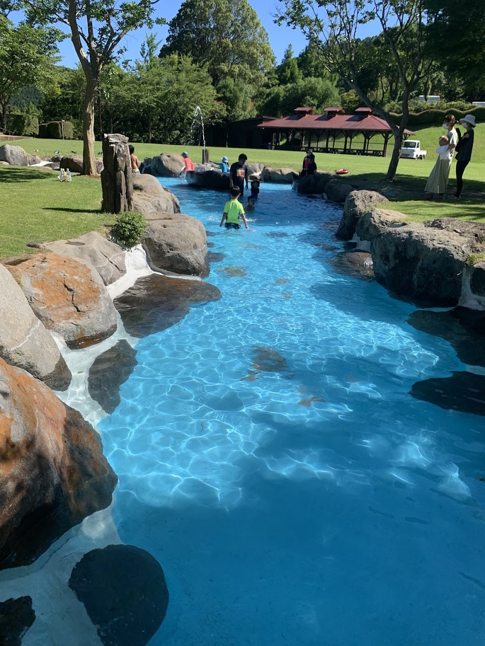 芝生・お風呂・遊び場が揃うファミリー天国!伊豆モビリティーパーク 家族で1泊利用しましたが、総合的に大満足のキャンプ場でした。 芝生の手入れが行き届き、子どもたちはイベント広場で思い切り走り回れます。広場のすぐ横にはお風呂があり、湯舟付きで22時まで利用できるのが嬉しいポイント。暑い日は水遊び場も大人気で、ちびっこたちが夢中になって遊んでいました。 サイトはアップダウンがあるため、遊びやすさ重視ならイベント広場に近い「Cサイト」が断然おすすめ。今回利用した高台のH2サイトは景色が良く広々していて、2世帯でも余裕の広さでしたが、行き来のしやすさはCサイトの方が上だと思います。 設営はコールマンのコクーン3ダークルームを使用。真っ暗で昼間も涼しく快適ですが、光がほぼ入らないため日中はランタン必須。それでもタープなしで快適に過ごせる広さと快適さは圧巻でした。 キャンプ前には車で10分のサイクルスポーツセンターにも立ち寄り、アトラクションやおもしろ自転車で遊び尽くし。芝生・お風呂・遊び場・アクティビティが揃った、ファミリーキャンプにぴったりの場所です!